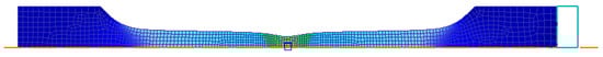 In order to test the material model as well as the model parameters derived from both the tensile test and FEM calculations, the process of cold rolling was simulated with Deform 2D by employing the Ramberg–Osgood approximation. The roll-gap geometry shown in Figure 3 was used for the simulation of the symmetric and asymmetric rolling trials. The geometry and technological parameters for both cases are listed in Table 1. In addition to the processing parameters, the coefficient of friction μ should be determined. In the present case, the minimal value of μ necessary for cold rolling was estimated by Equation (19), while the FEM simulations were conducted for a range of μ, exceeding μmin.