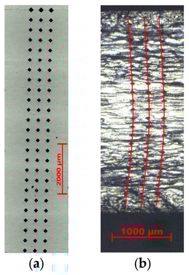 The flow of the investigated material during the rolling trials was examined experimentally by analyzing the distortion of the initially straight lines made by hardness indents on the transverse direction plane of the sheets (see Figure 9 and Figure 10). It is obvious that the symmetric and asymmetric rolling processes accounted for different deformation patterns. The diversity in the degree of distortion can be attributed to the differences in the shear strain distribution across the thickness. When the material is deformed symmetrically (both rolling cylinders rotate with an identical angular velocity), the symmetry plane is located in the mid-thickness part of the rolled sheet and the parabolic-type distortion is attributed to the shear strain localization within the subsurface region. In the case of asymmetric rolling, the symmetry is broken and the shear distribution is strongly affected by the roll-gap geometry as well as by the ratio of the angular velocities of the upper and lower rolls [45].