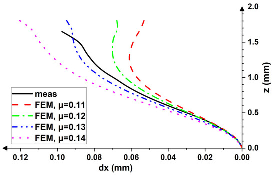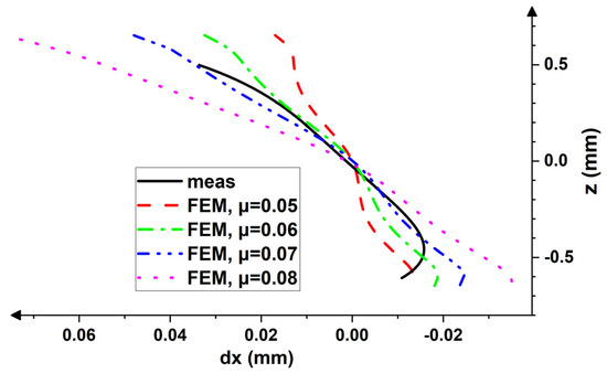 Figure 11 and Figure 12 show the simulated displacement patterns obtained by the FEM for various friction conditions and experimentally observed counterparts. The results of the calculation reveal that the displacement fields across the thickness can be successfully reproduced under the condition that the friction coefficient is known. In both cases, the successful simulation is carried out with the μ ≈ 1.1μmin (for symmetric rolling, the best fit is observed for μ ≈ 1.1μmin, while for the asymmetric trial, μ ≈ 1.13μmin). This result is consistent with the recently reported simulations [36].