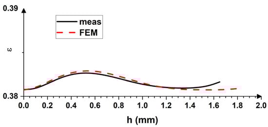 Similar to the calculations performed for asymmetric rolling, the distribution of the equivalent strain can be calculated for the conventionally rolled material as well. Figure 14 shows the measured strain (based on the displacement fields) and simulated profiles. It has been observed that the experimentally obtained data can be accurately reproduced by FEM calculations. It is important to mention here that the displacement fields cannot be examined in the close vicinity of the surface, since this region is subjected to the complex strain mode and the resulting distortions are quite severe within this thin subsurface layer [31,32,47].