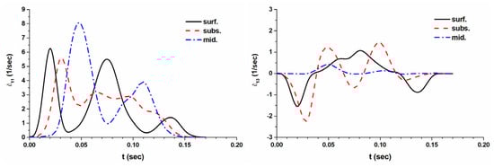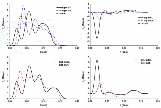 Strain rates in symmetrically rolled sheet, calculated by FEM for different thickness layers: surf.—is a surface layer; subsurf. layer is equidistant from both surface and middle; and mid. is the midthickness layer.
