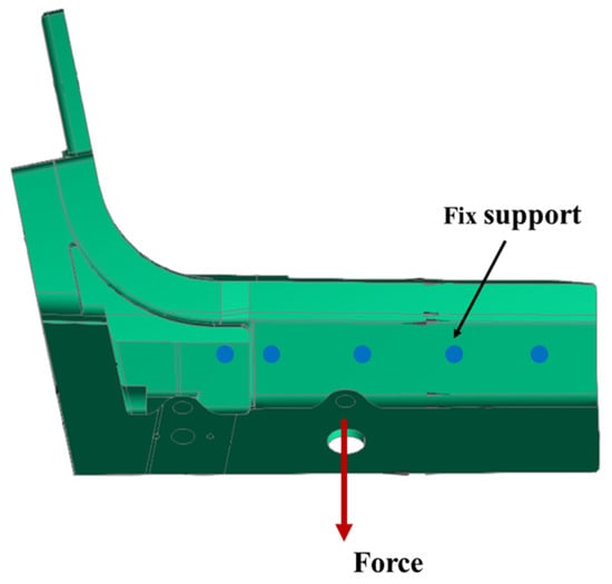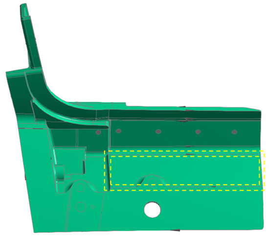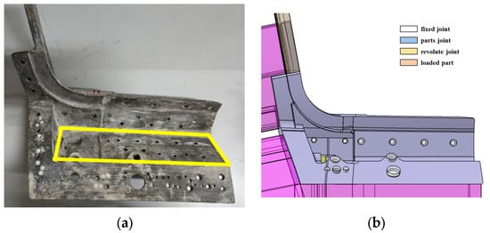 As shown in Figure 1a, yellow frame area is the main bearing surface and the main loading area for strength analysis and buckling analysis. Connection of the support is shown in Figure 1b, where white area in the middle is a fixed connection, and the green area is an adjacent connector. In the strength test, considering the force of the connection in the aircraft, these two areas are considered as the fixed ends of the strength test. Yellow and blue areas are the loading parts of the support, which are considered as the loading end of the test fixture.