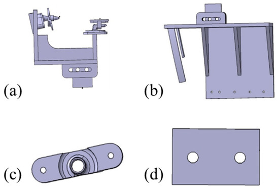The design of the test fixture is one of the links of the strength test [11]. It is necessary to design and manufacture the test fixture reasonably before the test. According to the general requirements of HB 7713-2002 for static strength test of aircraft structure, the strength test fixture is designed. In this paper, the stiffness of the test fixture material and the deformation generated in the test are considered. Influence on the test results should be as small as possible. Therefore, the fixture material should have significant stiffness. At the same time, it is also necessary to consider that the stiffness of the fixture gasket should be roughly the same as that of the test piece. If the difference is too large, it is easy to cause excessive local stress at the connection and cause damage to the test piece. Considering the design of the strength test, the fixture and gasket are shown in Figure 3, where a and b in Figure 3 are the loading end and the fixing end. The material is 30CrMnSiA structural steel of GB/T 3077-1988. The c and d in Figure 3 are gaskets, and the material is 2B06 aluminum alloy of GB/T 3190-2008.
