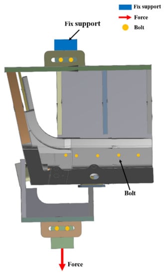 Structural strength design [7] is one of the most important parts of aircraft structure design [8]. The strength analysis, in this paper, includes both numerical calculation and strength test to verify whether the strength requirements are met. Structural strength test is an indispensable part of aircraft development. On the basis of HB 7713-2002 general requirements of static strength test for aircraft structure [9], we used the design load of 30.151 KN as the strength test load. In the strength test, it is necessary to reasonably select the loading mode of the test load, which should be the same as the real loading state of the aircraft [10]. The research object of this paper is the load-bearing assembly connected by the fuselage. Due to the complex geometry and loading conditions, the test fixture needs to be designed specifically.