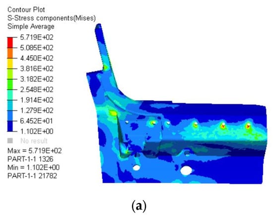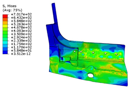 In the absence of disturbance, when the load in the load-bearing area of the load-bearing assembly reaches the critical load of nonlinear buckling, the displacement and deformation in the load-bearing area is 21.4 mm, and the corresponding stress situation is shown in Figure 14. The stress range on the load-bearing surface is 292.4~467.8 Mpa, which is less than the yield strength of the material; the stress in some areas reaches 701.7 Mpa, which exceeds the tensile strength of the material. At this time, the structure gradually loses stability. Since then, under the continuous load, the bearing capacity of the bearing area has decreased significantly, and the structure has entered the unstable state, which shows that it is necessary to consider the nonlinear buckling analysis.
