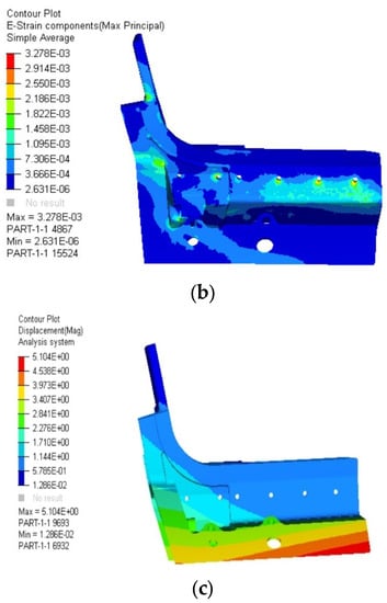 (a) Stress result; (b) Strain result; (c) Displacement result.