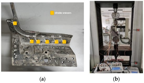 According to the force transmission characteristics and numerical analysis results of the test piece, the strength test confirms that the position of the test strain flower is S1~S6, as shown in Figure 7a. The strength test equipment is composed of a microcomputer-controlled electronic universal testing machine (WDW-100E), a static strain test and analysis system (TST3822EN), and a strain gauge sensor (BA120-3AA150 (16)-G1K-JQC). The final test assembly is shown in Figure 7b.