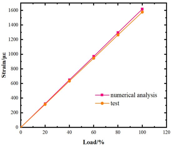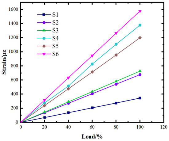 In the aspect of load loading, 5% of the test load is taken as the first level, and the load is coordinated to 100% of the test load step by step. Load is maintained for 30 s, as shown in Table 3. The load loading process is then unloaded step by step to no load. During the test, as the load is gradually loaded, the test piece, as a whole, produces a small displacement deformation in the loading direction. In the process of step-by-step unloading of the load, the displacement deformation generated by the test piece disappears, and no obvious cracks or damage occur during the whole process. Finally, the strain curve under the test load is shown in Figure 8. The maximum test strain is 1577.9 με at the position of the strain sensor S6, and the strain values at the positions of the remaining strain sensors, S1 to S5, are 344.5 με, 676.4 με, 726.7 με, 1378.1 με, and 1199.9 με, respectively. It shows that the strain situation of the area of the test piece gradually increased from left to right, and it relates to the thickness distribution of the test piece, where thickness on the left is greater than the thickness on the right.