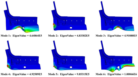 In the linear eigenvalue buckling analysis, considering the on-machine connection of the bearing assembly and the influence of the tensile load on the main bearing area, the stability of the bearing area is studied emphatically. Linear eigenvalue buckling analysis has created a step in Abaqus, and the procedure type of Buckle is used. Boundary conditions of the linear eigenvalue buckling analysis are established, as shown in Figure 11. All degrees of freedom are constrained at the fixed connection with the fuselage, and a fixed vertical unit load is applied in the bearing area. After the numerical analysis of eigenvalue buckling, the eigenvalue buckling of the first six order modes is solved.