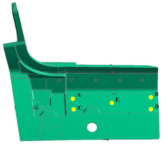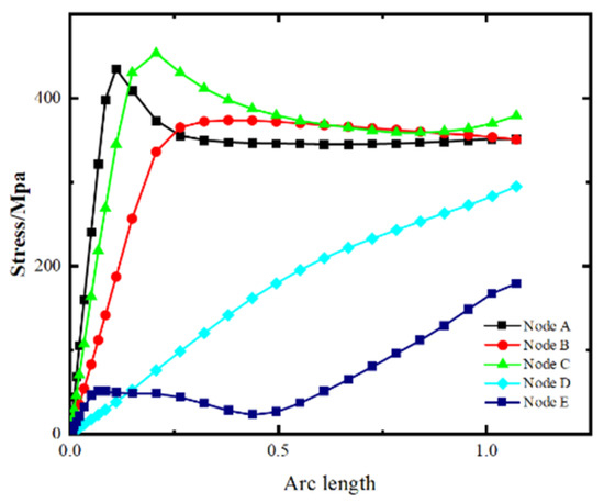 The stress curves of five nodes are extracted from the bearing surface area, and the node position is shown in Figure 15. The stress curves of nodes A to E are shown in Figure 16. Before reaching the critical load, the stress amplitude of nodes A, B, and C rises rapidly, and then, the stress level of the three points remains roughly unchanged. The stress of node E and node D increases with the load, and the stress at node D rises faster. However, when the load reaches the critical load, the stress levels of nodes E and D are smaller than those of nodes A, B, and C. From the results of stress analysis, when optimizing the structural strength, the structural strength of nodes A, B, and C should be considered emphatically, which improves the strength of the outer edge of the bearing area, as shown in Figure 17.