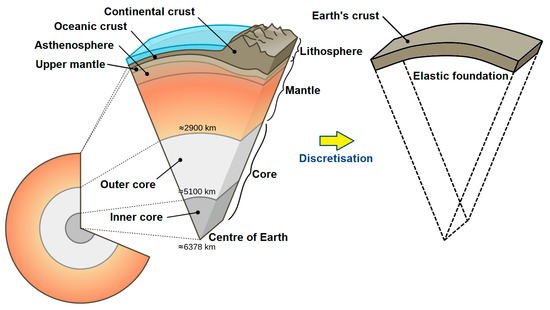 In the model, the upper mantle is replaced by a Winkler elastic foundation with the Modulus of the Foundation K = 107 Nm−3, as shown in Figure 1 and Figure 3 [9,13,14,15,19]. The elastic foundation is also applied in many engineering problems [24,25,26,27].
