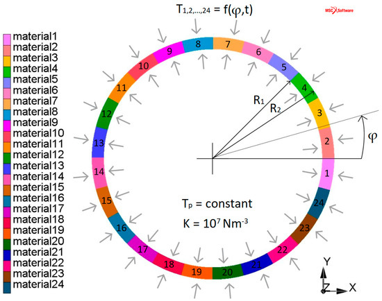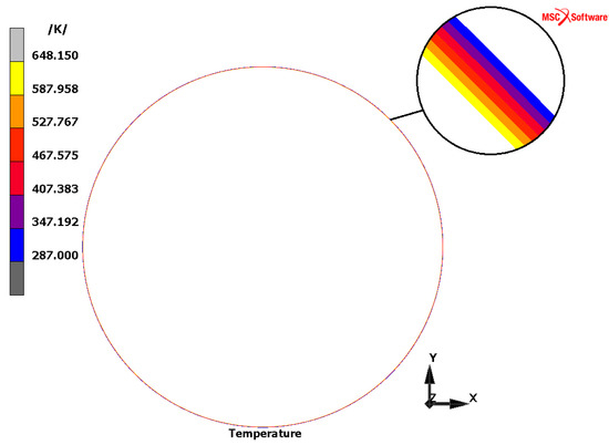 The initial preheating condition of the model determines the temperature at the beginning of the analysis in MSC.Marc Mentat 2006 software. On the inner surface, the temperature is prescribed, and on the outer surface of the crust, the temperature = 287 K is prescribed. From the mentioned initial temperatures and , the initial temperature distribution Tinitial is acquired. The initial temperature is independent of the angle φ but dependent on the radius R, as shown in Figure 5.