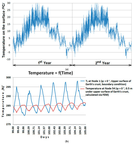 The temperature boundary condition (i.e., , as shown in Figure 2, Figure 3 and Figure 4), depends on time t and the angular dimension of the Earth and acts on the outer surface of the crust. This boundary condition simulates the cyclic temperature changes based on the daily cycle of the Earth’s rotation and the annual cycle of the planet’s orbit around the Sun. An example of dependence loading for 2 years and 5 days is shown in Figure 6.