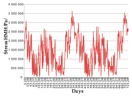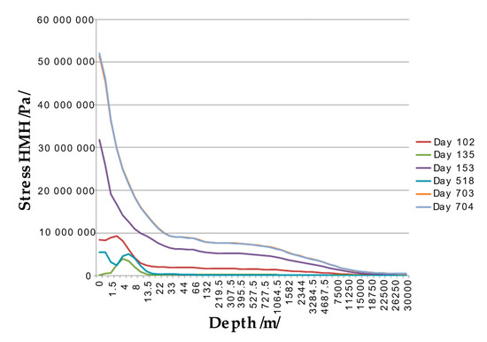 Plot of time dependence of the von Mises equivalent stress (HMH) /Pa/ at a depth of 2812.5 m between sections 1 and 2 of Figure 3 (φ = 0°).