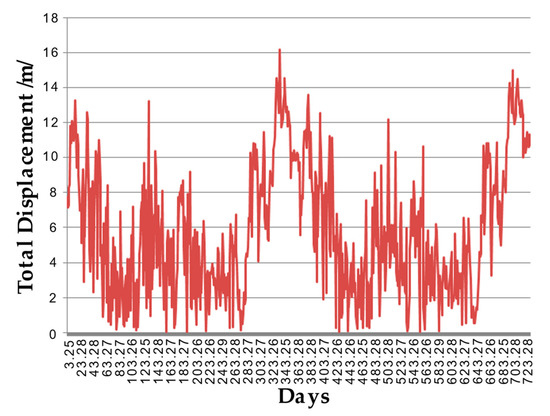 Figure 11 shows the time dependence of the total displacement at a depth of 2812.5 m between sections 1 and 2 of Figure 3 (φ = 0°). A large variance in displacement can be observed here too, i.e., the influence of the annual cycle of temperature changes.