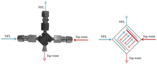 When considering compact heat exchangers, the concept of high-performance heat exchangers, which refers to a heat transfer area of 500–700 per unit volume (m2/m3) and a hydraulic diameter of less than 5 mm, is relevant []. In this paper, the compact heat exchanger used for the dynamic generation of subcooled water had a heat transfer area of 2990 per unit volume (m2/m3) and a hydraulic diameter of 0.32 mm, being a heat exchanger with an excellent performance and high compactness []. The details are in Table 1. The compact heat exchanger was designed based on thermal resistance balance combined with a microstructural approach []. The heat exchanger contains multiple fluid channels, each separated by one layer of the same fluid channel, where the working fluid enters the center from its respective inlet, and the multi-layered channels are divided on this side and converge at the outlet for outflow. The compact heat exchanger has a counter-flow heat transfer structure, in which low-temperature non-freezing liquid (NFL, 40 wt% aqueous solution of ethylene glycol) and tap water flow into the heat exchanger on both sides of the channel through convective heat transfer to dynamically generate subcooled water. This process is shown in Figure 1. The flow of low-temperature non-freezing liquid is higher than the flow of tap water so as to enhance the turbulence strength and save energy.