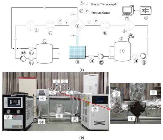 Subcooled water generation setup. (a) Schematic of subcooled water generation setup. (b) Photo of subcooled water generation setup. ① Compact heat exchanger. ② (High-temperature) thermostatic device. ③ (Low-temperature) thermostatic device. ④ Computer. ⑤ K-type thermocouple. ⑥ Turbine flowmeter. ⑦ Data recorder. ⑧ Pressure gauge. ⑨ Filter. ⑩ Ice storage tank. ⑪ Ball valve. ⑫ Water pump.