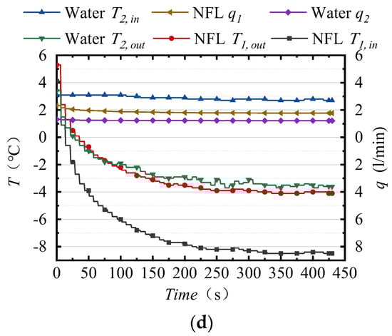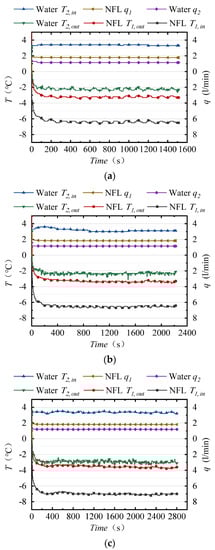 In these experiments on the dynamic generation of subcooled water, four groups of NFL were set to a temperature of −8.0 °C, considered to be the breakthrough condition for the subcooling degree, and the flow rate was kept at 1.900 L/min, with some reduction due to the influence of viscosity. A temperature of 3.0 °C was set as the inlet temperature for the tap water, and its flow rate was between 1.000 and 1.300 L/min, as shown in Table 2, adjusted according to the outlet water temperature. Since such experiments are conducted at low temperatures, heat loss in the pipeline occurs due to the sub-ambient temperature, and the inlet temperature of the compact heat exchanger is generally not equal to the set temperature of the thermostatic devices. The thermostatic device’s set temperature should be lower than the inlet temperature, at around 2~3 K for the low-temperature NFL loop. In the dynamic generation of subcooled water, the thermostatic device’s set temperature should be similar to the inlet temperature. There may be a temperature increase of 0.3 K, mainly affected by the flow rate.