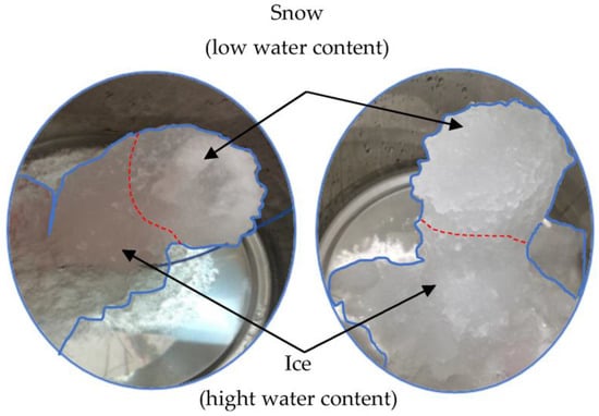 In this experimental study, the dynamically generated subcooled water was disturbed by the energy of the free-falling impact and ice slurry formed after the release of the subcooled water. Stalactite-like icicles formed as part of the continuous accumulation of the subcooled water. Their properties were soft and mud-like, and they contained water. As shown in Figure 4, the upper part of the icicles was drier and resembled snow, while the lower part consisted of a high water content, possessing a dark color and being ice-like. The experiment was conducted during summer, no air-conditioning system was set up, and the ice storage tank was insulated, even though it was a low-temperature environment. The generated ice or ice slurry partially melts, thus maintaining the low-temperature conditions in the tank. Ice slurry generation requires two conditions: the subcooling degree and the duration. Only when the temperature inside the ice storage tank falls below 0 °C will a large number of tiny ice crystals form in the stored subcooled water at the bottom of the tank, growing and accumulating over time. Here, we paid attention and aimed to control the amount of subcooled water in the tank, not only to ensure a large degree of accumulation, but because impact with the ice layer is more likely to result in release through subcooling. The ice slurry will be scattered when there is too much water, and the extraction of subcooled water from the ice storage tank will be interspersed, causing a loss of ice slurry, which can easily lead to freezing in the pipe. When the subcooling degree is 3 K or above, it is observed that ice crystals form more easily, ice slurry accumulates faster, and there is less ice or ice slurry to melt in order to maintain the low temperature. In brief, the greater the degree of subcooling is, the more easily ice or ice slurry forms, the longer it lasts, and the more ice is formed.
