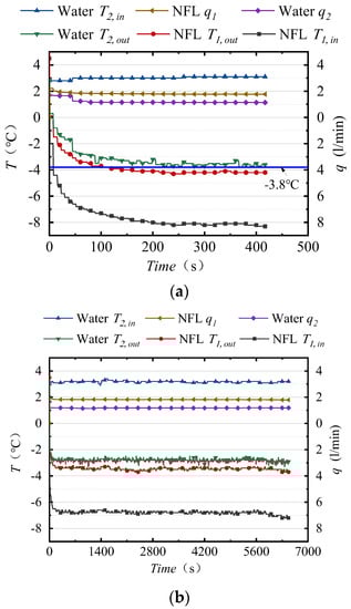 Figure 5a,b presents the maximum subcooling temperature of 3.8 K obtained in the experiment and the maximum duration time of 108 min obtained at an average subcooling temperature of 2.8 K, respectively. When the inlet temperature of the tap water is 3.1 °C and the flow rate into the heat exchanger is 1.140 L/min, the inlet temperature of the NFL is adjusted to −8.1 °C, and the flow rate is 1.780 L/min. The inlet and outlet temperatures of the tap water change by 6.9 K, and the maximum subcooling degree of the subcooled water reaches 3.8 K. This result is superior to that of experiments conducted using pure water, with only a 3.8 K change in the inlet and outlet temperature difference and a 3.3 K subcooling temperature in comparison to the double-tube heat exchanger []. In the dynamic generation of subcooled water, all the parameters remained in a dynamic equilibrium, with small fluctuations for the first 350 s. After that, the generation of subcooled water ceased due to a certain drop in the NFL temperature, which induced the occurrence of ice blockage. Under these conditions, the ultimate subcooling degree (3.8 K) of this compact heat exchanger was reached.