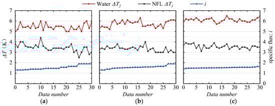Figure 6 shows that in the statistics of different subcooling degrees, i varies in a range of less than 1. When the subcooling degrees increase, there is a tendency towards decline with the variation in the inlet and outlet temperature difference, regardless of whether tap water or NFL is applied. From the correlation of the experimental results, we can conclude that to achieve a greater subcooling degree, both the tap water and NFL in the heat exchanger inlet must maintain a uniform temperature and flow rate (or both sides of the inlet temperature must be synchronized with the exact amplitude change, although the amplitude should be as small as possible, with a low change frequency).