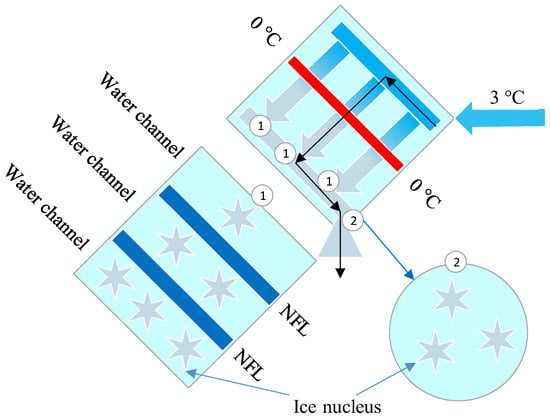 Schematic of ice nucleus formation in heat exchanger channels. ① and ② represent the locations that cause perturbations in the subcooled water such that ice nucleus are generated. The symbols of gray stars represent ice nucleus.