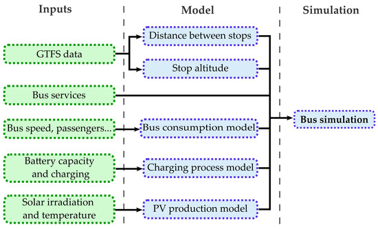 In this section, the modelling approach of the transportation network is presented to determine the charging powers and time delays of EBs. First, the technical terms used to characterize the bus network are defined, then the utilized input data are presented with the deployed models and the simulation approach. The modelling steps are presented in Figure 1. The inputs represent the bus network, the bus fleet operation, the solar irradiation, and the assumptions made on the bus technology and the charging infrastructures. General Transit Feed Specification (GTFS) data are used for modelling the bus network accurately. Models of bus consumption, charging process, and PV production are then integrated into a simulation process to analyse the operation of a bus fleet.
