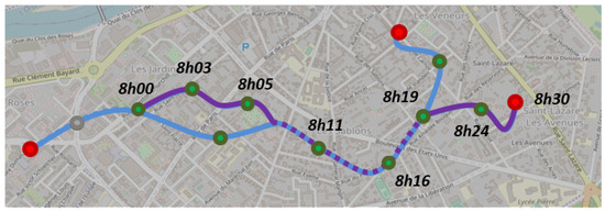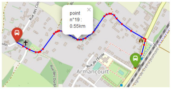 Firstly, the distance between stops are determined. Based on the latitude and longitude information, a path between two bus stops is generated on Open Street Map using a “bus” transportation mode. To generate the path, Open Street Map creates a sequence of intermediate points on the road between the two stops with a higher density in curved portions (see Figure 4), and defines the total distance as the sum of distances between each intermediate point. This matches quite accurately the real path of the bus; however, it requires manual verification that the path proposed by Open Street Map fits the one on the bus network map.