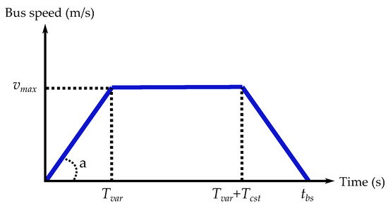 The speed of the bus must be determined based on the distances and travel times between bus stops taken from the GTFS data in order to calculate the power consumption. Inspired by SORT standard driving cycles [48,49,50], the present paper considers a speed profile with a trapezoid shape between two consecutive bus stops, as seen on Figure 3.