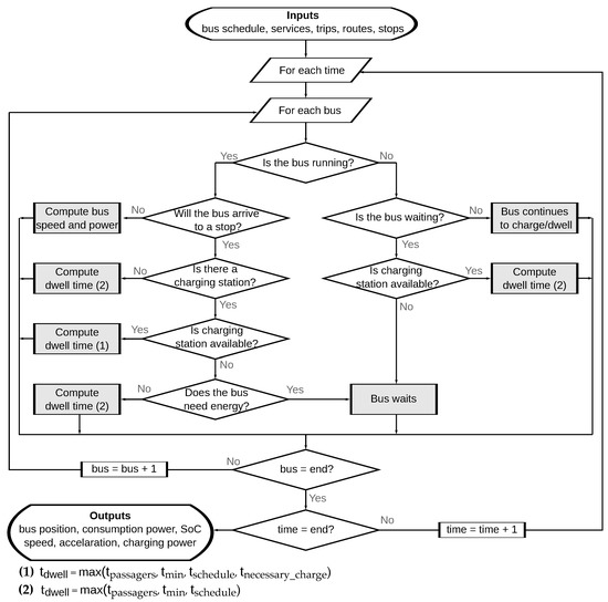Simulation inputs are the transport network modelling (GTFS data) and the bus fleet operation (bus services). The distance that a bus has to travel from each stop to the next charging station can be calculated for each bus service. The energy needed to reach the next charging station can be calculated based on this distance. Therefore, it is possible to ensure that a bus does not leave a charging station until it has enough energy to complete its service. The procedure of calculation of bus power consumption on a transportation network is presented in the flow chart in Figure 5. Inputs are first initialized such as bus services, trips, and routes. Then, for each time step of the simulated period, the status of each bus is determined successively: its position, speed, acceleration, service, trip, route, energy consumption, charged energy (if the bus is at a charging station), remaining dwell time (if the bus is at a stop), and battery SoC.