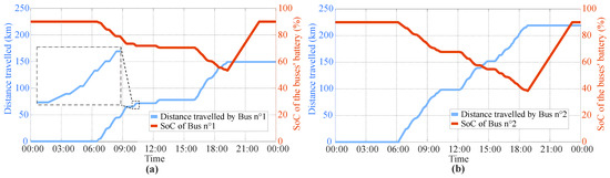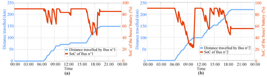 Travelled distance and battery SoC of buses n°1 (a) and n°2 (b)—scenario 3.