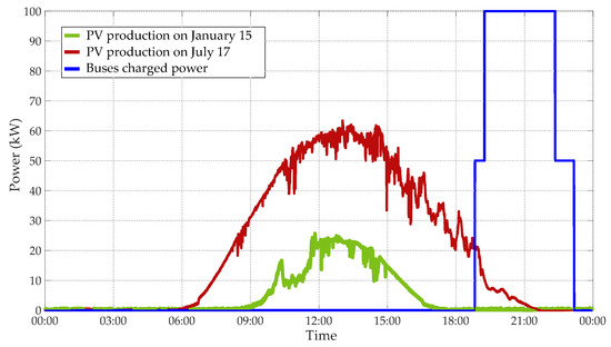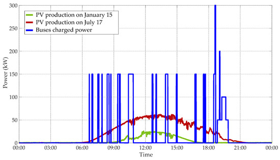 It can be seen in Figure 11 that the two buses recharge during a short period at line terminals, usually not at the same time. However, the total charging power reaches 300 kW for 4 min at 18:36 when both buses are charging at bus terminals and 200 kW for 3 min at 19:02 when bus n°2 arrives at the terminal and bus n°1 is at the depot. The charging process occurs mainly during the day, when electricity is produced by PV panels. As for PV energy, 81 kWh are used directly to charge buses during the day, but additional stationary storage would increase the PV share during the day and allow the use of PV energy during the night.