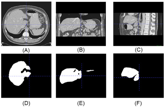 Upper line is the three-view drawing of the liver CT, lower line is the corresponding label. (A) Top view of the CT. (B) Side view of the CT. (C) Front view of the CT. (D) Top view of the label. (E) Side view of the label. (F) Front view of the label.