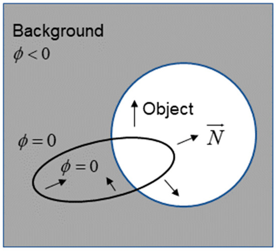 The LSM is a commonly used method for medical image segmentation. The basic view is to express an active profile implicitly as a zero level set of an embedding function in a higher dimensional space. In other words, the zero level set curve can be found at any moment by obtaining its level set embedding function [24]. As shown in Figure 4, the zero set of the embedding function is the active contour , in which the points all obtain positive values inside, while the outside points obtain the opposite. Furthermore, the outside part is the direction of the curve normal vector . Thus, LSM can effectively combine the object’s boundary and region information to achieve better segmentation results by constructing an effective embedding function .