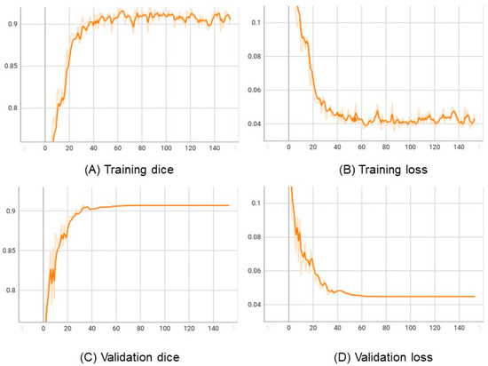 The learning curves of the VLSM-Net in LiTS: horizontal axes represents epochs. (A) Vertical axis represents training dice. (B) Vertical axis represents training loss. (C) Vertical axis represents validation dice. (D) Vertical axis represents validation loss.