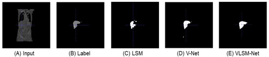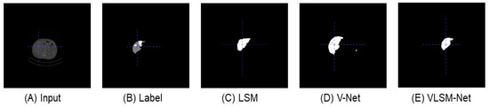 Figure 6 shows the predicted images of different segmentation models in the LiTS dataset from the front view. In Figure 6C, compared with the original input image and the label, the predicted result of the LSM include several disconnected parts, and its main area is smaller than that in the label (see Figure 6B). In Figure 6D, the predicted result of the V-Net model includes fewer disconnected parts, and in which the main area is similar with the label. The result of the VLSN-Net model is depicted in Figure 6E; there is only one area recognized, which is identical to the label, although a small part is missing.