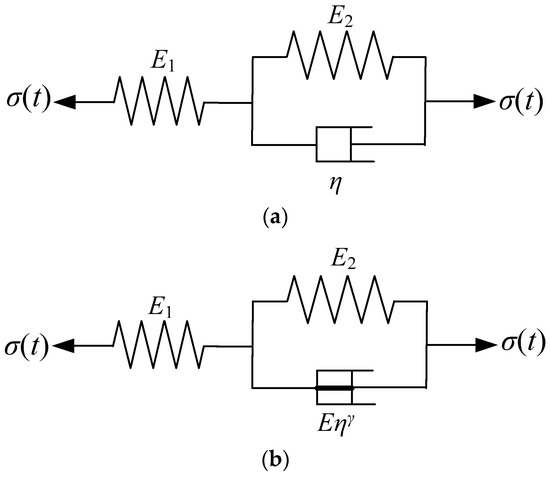 The three-parameter solid model is one of the essential models of viscoelastic materials. It is made of one spring and one Kelvin model in series, as shown in Figure 2a. It can be used to show instantaneous elastic deformation, deceleration creep deformation, and asymptotic creep deformation, as well as the relaxation properties of materials. With its advantages, it has been used to analyse the viscoelastic characteristics of many materials [28]. Therefore, the distributed order rheological model was established based on the three-parameter solid model. The damper components in the integer-order model were changed into the distributed order damper, as shown in Figure 1b. Thus, the distributed order three-parameter solid model was obtained, as shown in Figure 2b.