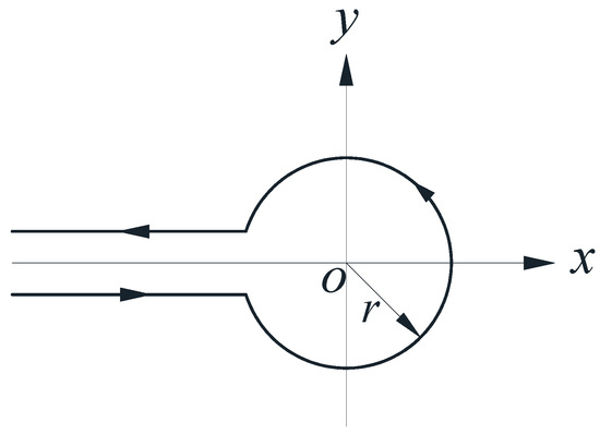 Next, the complex plane was cut. Equation (29) could be calculated by converting the contour integral into Hankel’s integrals. According to the definition of a fulcrum, the operator had two fulcrums, that is, s = 0 and s = ∞. The complex plane was cut along the negative real axis to obtain the single-valued branch. The contour integral (Figure 3) was converted into the Hankel integral path (Figure 4).