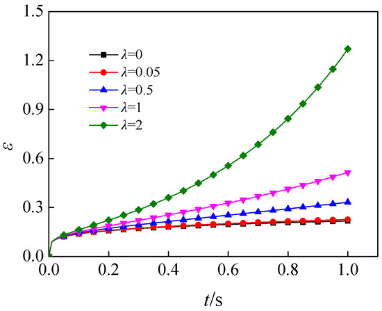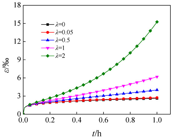 A calculation example: By substituting a of 0.1, b of 0.3, and σ0 of 1 into Equation (34), the curves of the creep properties could be calculated with various damage parameters λ, as shown in Figure 8.