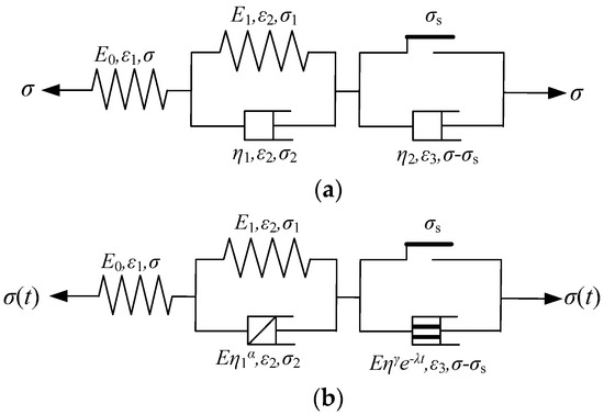 Viscoelastic materials will continuously increase deformation under external loads, called creep deformation [8]. The continuous creep deformation will damage the materials and make the structure unstable [9]. The basic premise of establishing an accurate creep damage model is to reveal the instability mechanisms of the structure of viscoelastic materials based on experimental mechanical results [10]. Scholars have constructed several creep models of viscoelastic materials based on mathematical and mechanical theories, which can provide theoretical references for the analysis of materials’ viscoelastic and creep damage characteristics. The basic models established by the classical theory of mechanics, such as the Maxwell model, Kelvin model, three-parameter solid models, etc., can reflect rock materials’ deformation characteristics in the stages of instantaneous elasticity, constant creep, and accelerated creep [11]. Based on these basic models, some complex models have been established to describe the whole creep process of rocks, including the Poyting-Thomson model and visco-elastoplastic models, etc. [12,13,14,15]. The creep above models can reflect the deformation characteristics of rock creep in various stages. They essentially reflect the stress and deformation characteristics of rocks at certain points. However, the creep failure of rocks is caused by damage accumulation at different times [16]. Therefore, classical theories have limitations. Compared to classical theories, fractional calculus theory focuses on the research of the creep deformation of rocks and can accurately describe global characteristics [17,18].