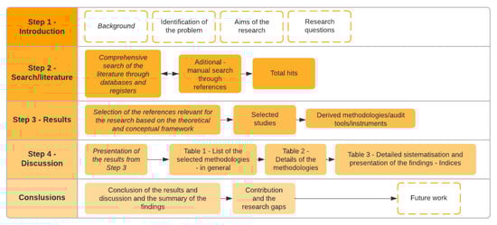 The methodological procedure of this paper refers to an extensive review of the literature and articles on the topic of pedestrian environment evaluation. The research of this paper was performed using the following phases: Introduction (Section 1), with research problems and questions, also with the aims and goals; Online search of the literature (Section 2); Results with the criteria for the selection of the research and analysis of the selected papers and discussion of the presented results, with presentation (Section 3); Conclusion (Section 4); Literature and references. The methodology of this paper is presented in Figure 1.