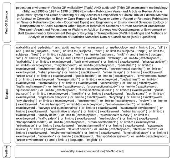 In order to identify appropriate studies, we applied a predefined criteria search through two categories: (1) papers considering the pedestrian environment or walkability or the neighborhood environment and (2) audit-tool-related or papers with a specific measurement instrument or assessment procedure or scale or tool. During the search of relevant literature through these databases, keywords were used according to the following model: PEDESTRIAN ENVIRONMENT (and) (WALKABILITY (or) AUDIT TOOL (or) ASSESSMENT. The search strategy for the mentioned databases is shown in Figure 2.