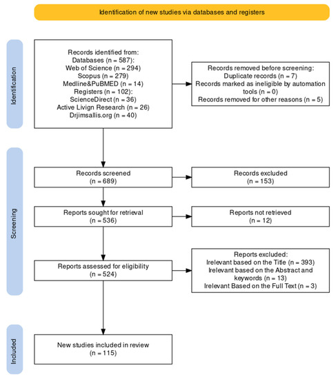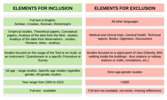 Articles were excluded if they met the following criteria: language other than English that we were not able to understand (or Southern Balkan native languages); focused on medical and clinical trials, general health-oriented, technical report opinions, and discussions; studies with a focus on obesity, body mass index, walking inside buildings, and pedestrian simulations; strict age/gender studies; older than the year 2000; and full text not available or missing. A preview of the inclusion or exclusion criteria is shown in Figure 4.