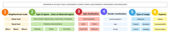 According to the dimension of the observed tools, their domains and aspects, their level of significance, and their level of reliability, there are several tools identified: the Pedestrian Health-Oriented Audit (PHOA) [27]; Study of Environmental and Individual Determinants of Physical Activity (SEID) [28]; Neighborhood Environment Walkability Scale (NEWS) [29,30,31,32,33,34,35]; Microscale Audit of Pedestrian Streetscapes (MAPS) [36,37,38]; Neighborhood Brief Observation Tool (NBOT) [39,40]; Irvine–Minnesota Inventory Form (IMI) [41,42,43,44]; SPOTLIGHT-Virtual Audit Tool (S-VAT) [45]; Collaborative Research of AGEing in EU (COURAGE) [46]; Active Neighborhood Checklist (ANC) [47,48,49,50]; Systematic Pedestrian and Cycling Environmental Scan (SPACES) [51,52,53]; Environmental Profile of a Community Health (EPOCH) [54]; Path Walkability Assessment (PWA) [25]; Walkability Assessment Checklist (WAC) [55]; Senior Walking Environment Audit Tool (SWEAT) [56,57,58,59]; International Physical Activity Questionnaire (IPAQ) [60,61,62,63,64,65,66]; Path Walkability Indicators (PWI) [67]; International Physical Activity & Environment Network (IPEN) [68,69]; Road Safety Audit (RSA) [70]; Pedestrian Level of Service (PLOS) [71,72]; Gross Sidewalk Walkability Index (GSWI) [73]; Pedestrian Environment Data Scan (PEDS) [74,75]; Path Environment Audit Tool (PEAT) [76]; Active Accessibility (AA) [77]; Field Survey Instrument (FSI) [78]; Physical Activity Resource Assessment (PARA) [79]; Analytic Hierarchy Process (AHP) [80]; Utah Household Travel Index (UHTS) [81]; Pedestrian Environment Quality Index (PEQI) [82]; Parks, Activity and Recreations among Kids (PARK) [83]; China Urban Built Environment Data Scan Tool (CUBEST) [84]; Pedestrian Environment Review System (PERS) [85]; Virtual—Systematic Tool for Evaluating Pedestrian Streetscapes (V-STEPS) [86]; Audit of Physical Activity Resources for Seniors (APARS) [87]; Physical Activity Neighborhood Environment Scale (PANES) [88,89,90,91,92,93]; Graduate Ready for Activity Daily (GRAD) [94,95,96]; Environmental Assessment of Public Recreation Spaces (EAPRS) [97,98]; Walk Score Index (WSI) [99,100,101,102,103]; School Audit Tool (SAT) [104]; Public Space Quality Index (PSQI) [105,106,107]; Walking Suitability Index for Territory (T-WSI) [108,109,110].
