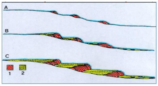 Dams and backside pools usually follow one another along the watercourse forming characteristic depositional systems (Figure 6) [6,21,24].