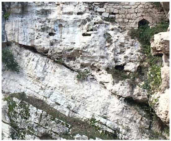 The deposition of calcareous tufa may give rise to construction landforms such as small mounds at springs and dams across the riverbeds or coatings of steep slopes, rough river beds, or swamp/lake bottoms generally lacking a recognizable shape [6,31,32]. These features are geologically not durable as the construction process can be interrupted, and landforms can be destroyed, in whole or in part, by erosion [6]. Bedding within the deposit, where present, is usually inclined and undulated and rarely horizontal; thin laminations resulting from daily/seasonal variations are often recognizable [6].