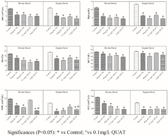 The results obtained in the present study clearly showed that also WBC and PLT from blood samples of horses and cows suffered the exposition to both xenobiotic compounds. As a matter of fact, these cell populations showed significantly decreased values following Quaternium and Thiacloprid exposure. Concerning PLT, it has been previously shown that the production of free radicals in the bone marrow as a consequence of xenobiotic exposition causes a decrease in PLT, altering thrombopoiesis [37]. The decreased values of PLT as well as of the WBC found in the blood samples from horses and cows exposed to Quaternium and Thiacloprid, compared to the blood samples not exposed to these xenobiotics, may be related to the toxic effects of these compounds on the cells in the blood circulation. Indeed, being this study an in vitro investigation on peripheral blood samples, it is not possible to know the outcomes of Quaternium and Thiacloprid at the hematopoiesis level.