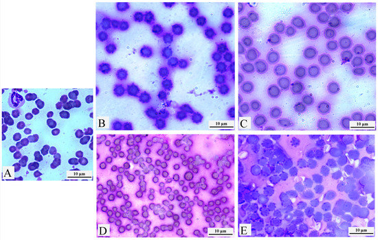 Erythrocytes appearance at light microscope (100× objective) obtained from equine blood samples not exposed to xenobiotics (A) and blood samples exposed to Thiacloprid at 30 µg/mL (B), Thiacloprid at 60 µg/mL (C), Quaternium-15 at 0.1 mg/L (D), and Quaternium-15 at 1 mg/L (E).