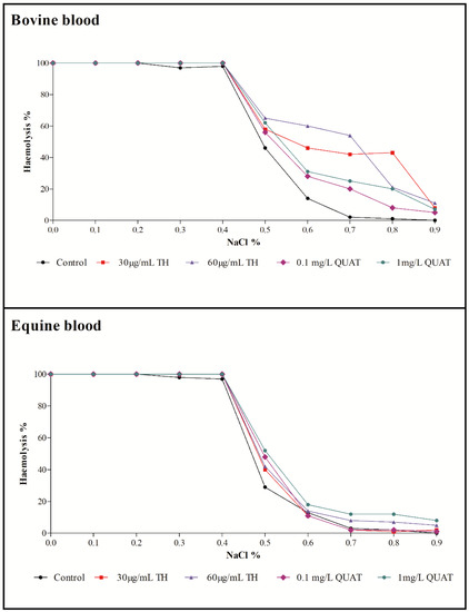 Xenobiotics, in particular pesticides and their careless use, can negatively affect the environment and animal and human health [34]. To the authors’ knowledge, this is the first study assessing the effects of Quaternium-15 and Thiacloprid on erythrocytes parameters, including EOF in horse and cattle blood, through in vitro whole blood exposure. Despite being preliminary, the current study emphasizes the concept that all blood cells are an excellent target for evaluating the effects of xenobiotics.