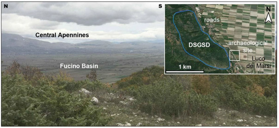 Panoramic view of the Fucino Basin, taken from the Luco dei Marsi ridge (from SW). The insert contains a panoramic view (produced with Google Earth) of the DSGSD, and the main anthropic elements present in the study area.